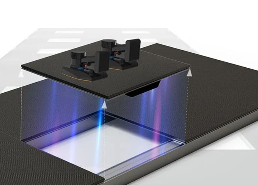 Det interaktive systemet med innebygde lasersensorer og MCU-brikker er egenutviklet.. 10 millisekunder med berøringsfri interaksjon sikrer presis og umiddelbar respons på enhver fysisk bevegelse på overflaten.